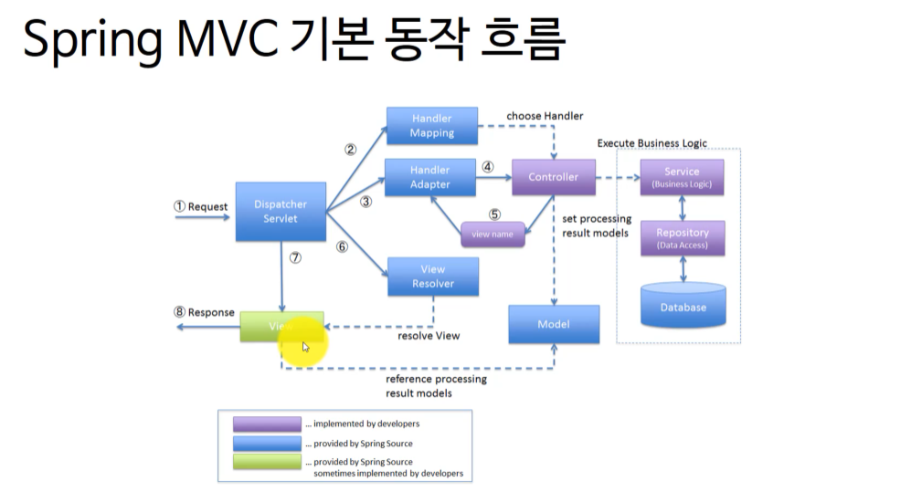 : springMVC는 로직과 화면을 분리하는 '모델2' 방식으로 처리된다.