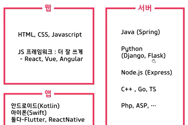 개발언어 : HTML, CSS, JS를 제외하고 대부분의 언어로 서버를 만들 수 있다고 봐도 무방하다.