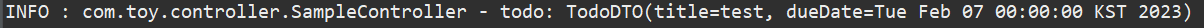 Date타입으로 자동 변환되지 않기 때문에 @InitBinder로 처리를 하지 않으면 "dueDate=2023-02-07(문자열)"의 값은 제대로 전달되지 않는다.